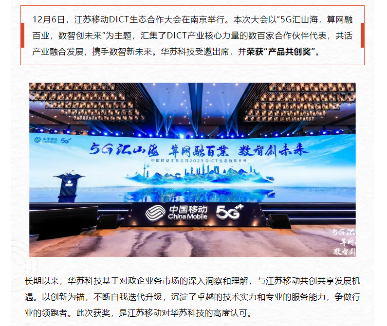 華蘇科技榮獲江蘇移動2023DICT生態合作“產品共創獎”