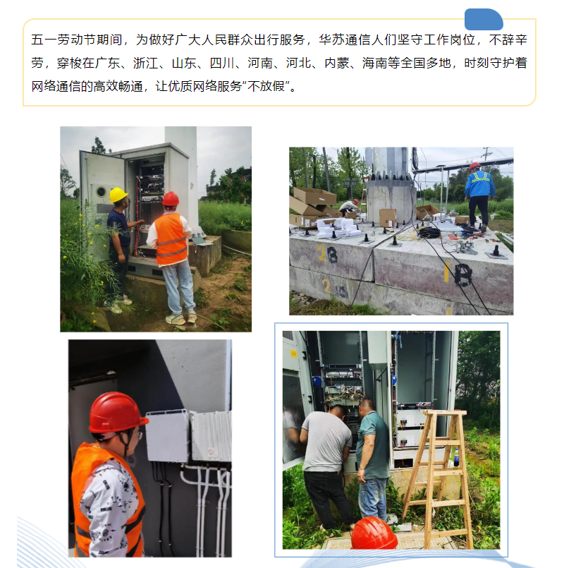 五一勞動節(jié)期間,為做好廣大人民群眾出行服務(wù),華蘇通信人們堅守工作崗位,不辭辛勞,穿梭在廣東、浙江、山東、四川、