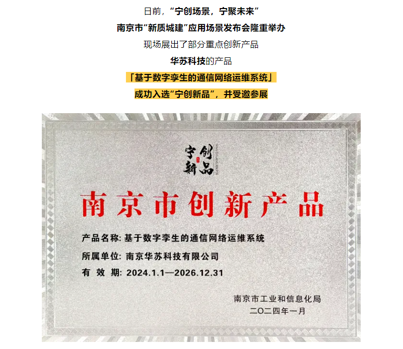 華蘇科技 的產(chǎn)品「基于數(shù)字孿生的通信網(wǎng)絡(luò)運維系統(tǒng)」成功入選“寧創(chuàng)新品”,并受邀參展南京市“新質(zhì)城建”應(yīng)用場景發(fā)布會。