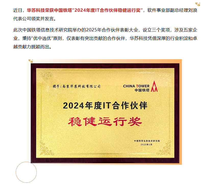 華蘇科技獲中國鐵塔IT穩健運行獎