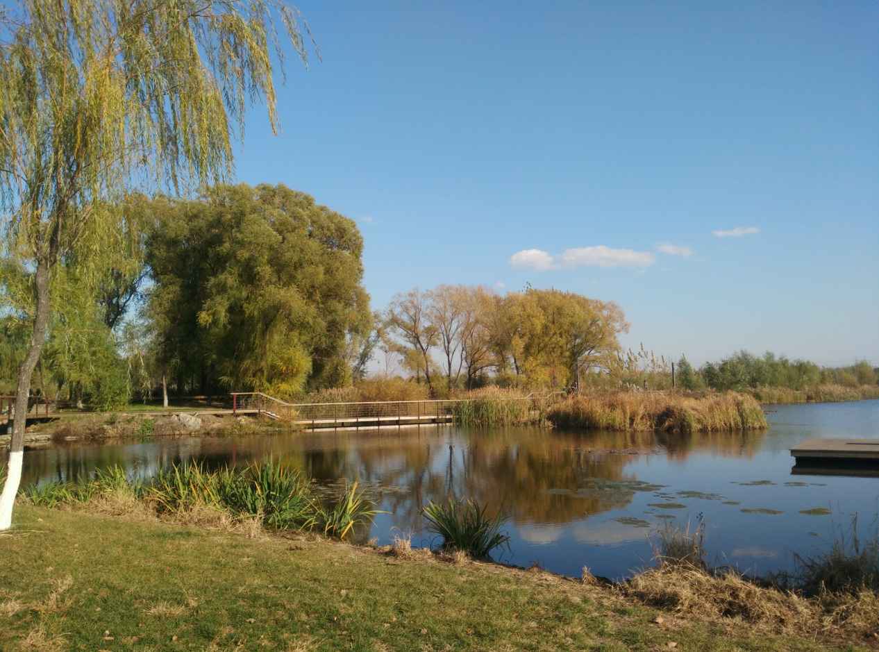 寵辱不驚,閑看庭前花開花落,去留無意,漫隨天外云卷云舒。碧波隨微風漾開,與藍天相映成一色,一彎木橋盤旋于湖面之上,視野便隨其蜿蜒展開,置身其中如置身畫卷,如何不做感慨!